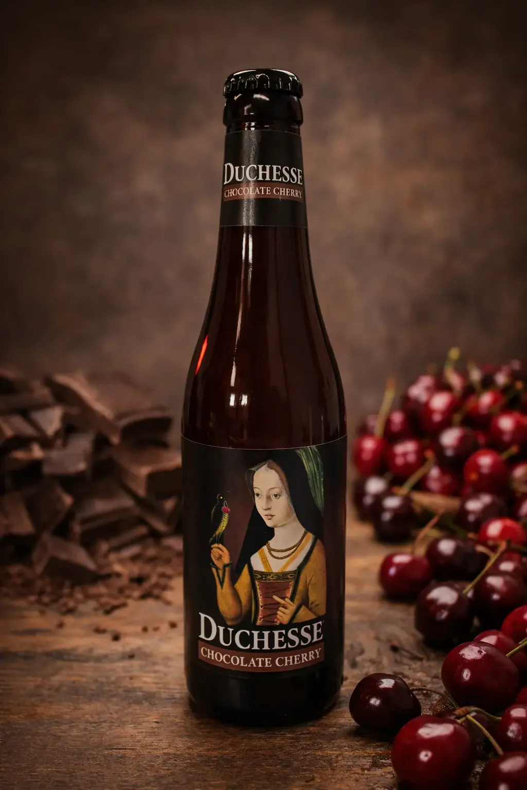Duquesa de Borgoña tradicional con cerezas belgas y esencia de chocolate añadida durante el proceso de maduración en barricas de roble (foeders). Se utilizan 20 kg de cerezas belgas enteras para la producción de cada 100 litros de Chocolate Duchesse Cherry.